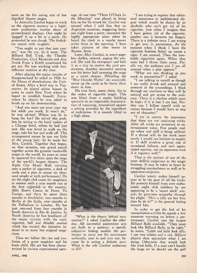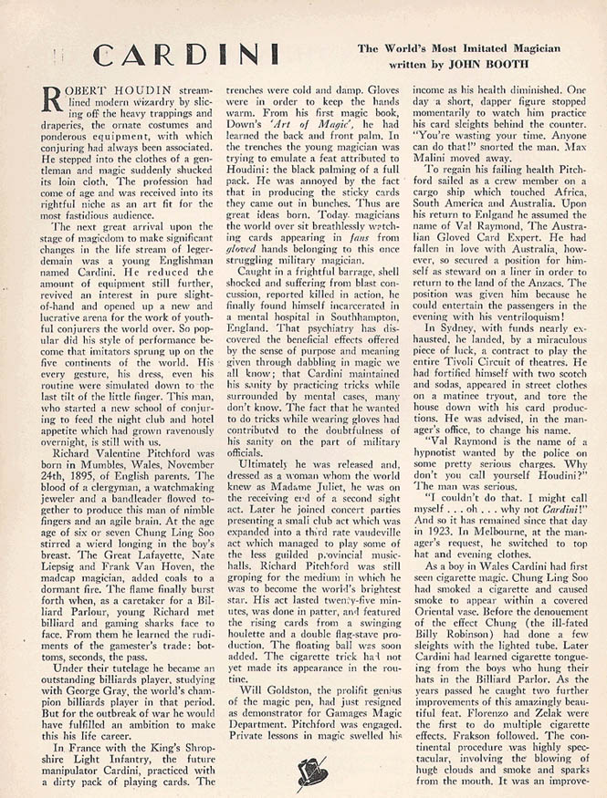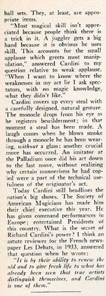 "Today Cardini still headlines the nation's big shows. The Society of American Magicians has made him their chief executive this year. He has given command performances in Europe; entertained Presidents of this country."