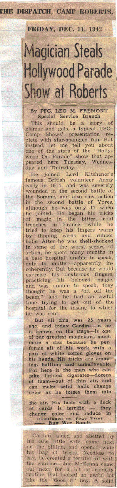 Cardini-- as he is known on the stage-- is one of our greatest magicians, much more a star because he performs his work with a pair of white cotton gloves on his hands. His tricks are amazing, baffling and unbelievable. For here is the man who can take lighted cigarettes-- dozens of them -- out of thin air, and can make solid balls change color as he tosses them into the air