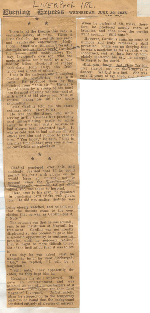 "I sat in the audience and I watched Cardini do bewildering feats with cards. He produced them by the hundred from "thin air." He transformed them by a sweep of his hand into the most amazing fashions-and all with a pair of kid gloves on. This, of course makes his skill far more astounding."