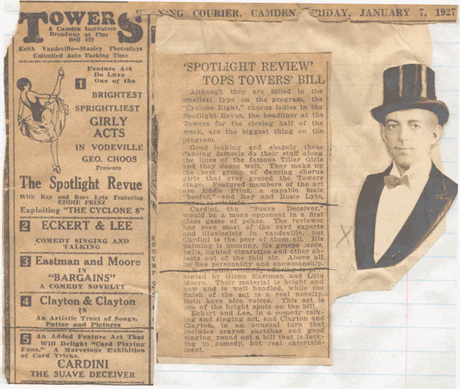 "The reviewer has seen most of the card experts and illusionists in vaudeville, but Cardini is the peer of them all. His palming is uncanny. He grasps cards, bells, lighted cigarettes and other objects out of thin air. Above all, he has personality and showmanship."