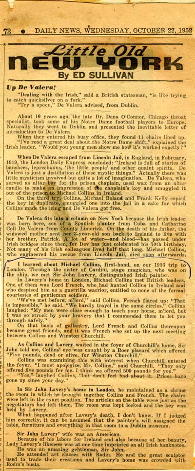 "I learned about Michael Collins, first-hand, on our 1936 trip to London. Through the sister of Cardini, stage magician, who was on the ship, we met Sir John Larery, distinguished Irish painter."